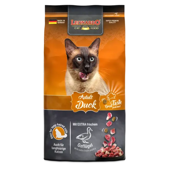 Leonardo Adult (Утка) — это сухой корм супер-премиум класса для взрослых кошек старше 1 года. В основе рациона - легко усвояемая утка, которая подходит питомцам, склонным к аллергии, а также привередливым котам. В состав входят семена винограда холодного отжима, добавлены креветки, а также ракообразные из Антарктики, богатые полезными веществами.