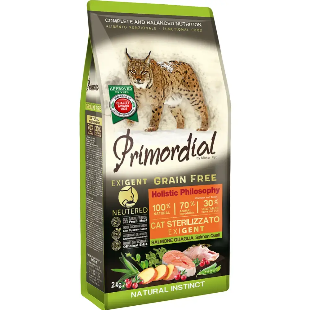 2кг Корм Primordial Cat Adult Neutered Skin&Coat беззерновой для взрослых стерилизованных кошек для здоровья кожи и шерсти с Лососем и индейкой