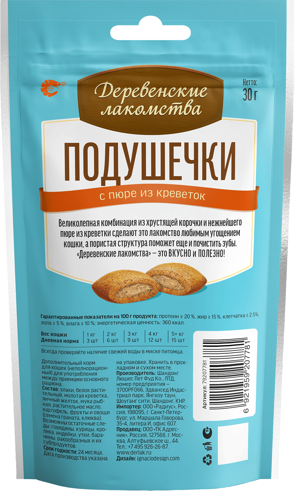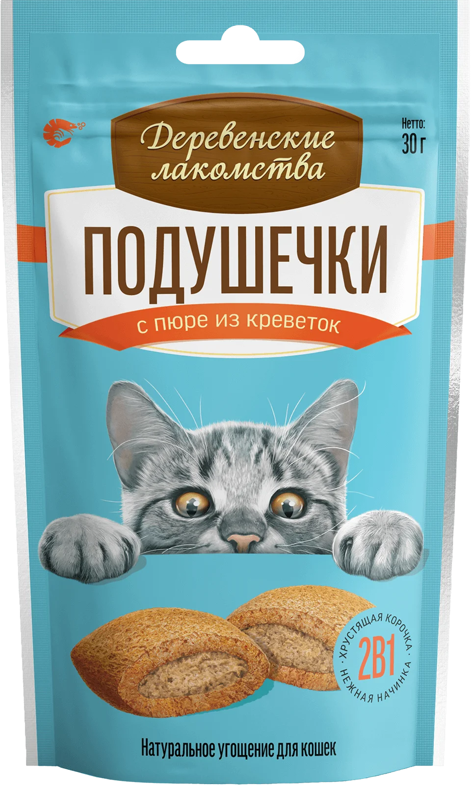 30г Лакомство "Деревенские лакомства" для кошек подушечки с пюре из Креветок