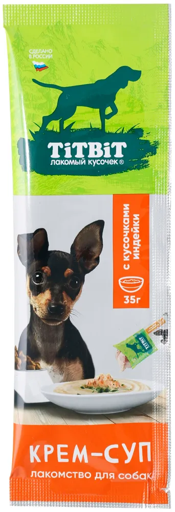ТИТБИТ Крем-суп для собак с кусочками индейки —  это влажное лакомство, нежной кремовой текстуры с кусочками мяса. Изготовлен из натуральных ингредиентов, содержит 98% мяса. Порция рассчитана на один прием пищи, идеально дополнит и разнообразит рацион вашего питомца. Удобная упаковка позволяет кормить питомца прямо с рук или брать с собой в дорогу. Подходит собакам любых пород и размеров, старше 12 недель.