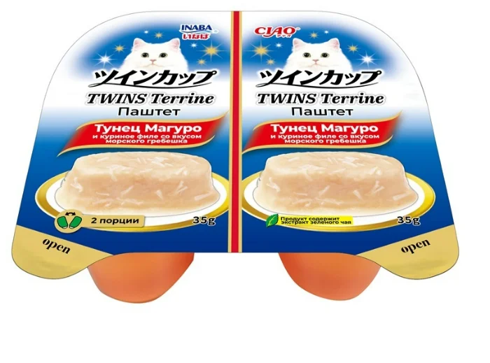 INABA CIAO TWINS Terrine Паштет Тунец Магуро и куриное филе со вкусом морского гребешка — супер-премиальный паштет для кошек CIAO TWINS Terrine (ЧАО ТВИНС ТЕРРИН) от японского производителя Inaba приготовлен на основе мяса глубоководного тунца Магуро и кусочков филе фермерской курицы с добавлением морского гребешка. Внутри упаковки влажный корм в виде нежного паштета, который подойдет даже самым привередливым кошкам и кошкам с чувствительным пищеварением.