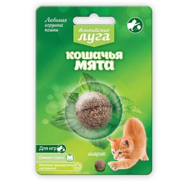 Альпийские луга Кошачья мята - это шарик из кошачьей мяты для кошек.Игрушки с кошачьей мятой станут любимыми игрушками каждой кошки:- агрессивные и легко возбудимые кошки станут более спокойными и уравновешенными;- флегматичные кошки станут более подвижными, игривыми, контактными со своими владельцами.Кошачья мята не вызывает зависимости и привыкания, пользоваться ею полностью безопасно. Могут не обращать внимания на кошачью мяту котята до 6 месяцев и пожилые кошки