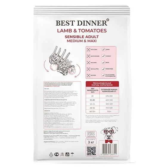 Высококачественный полнорационный корм для собак средних и крупных пород Best Dinner с ягненком и томатами создан специально для собак с особыми потребностями. Томаты - источник холина и каротиноидов. Способствуют профилактике болезней сердца и укрепляют иммунитет. Нежное мясо ягненка обладает отличной усвояемостью и подходит для собак склонных к аллергическим реакциям и проблемами с пищеварением.