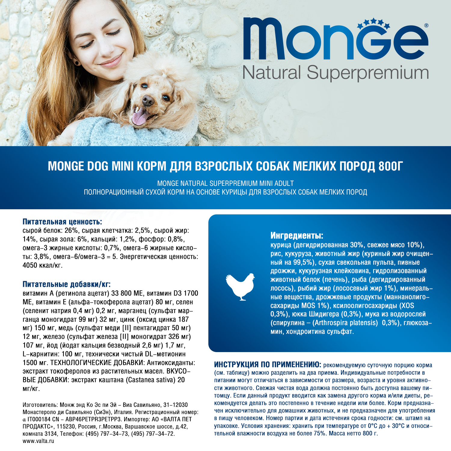 • Легко усвояемое мясо курицы на первом месте в составе корма и содержание L-карнитина позволяет питомцу долгие годы сохранять активность и хорошую физическую форму.