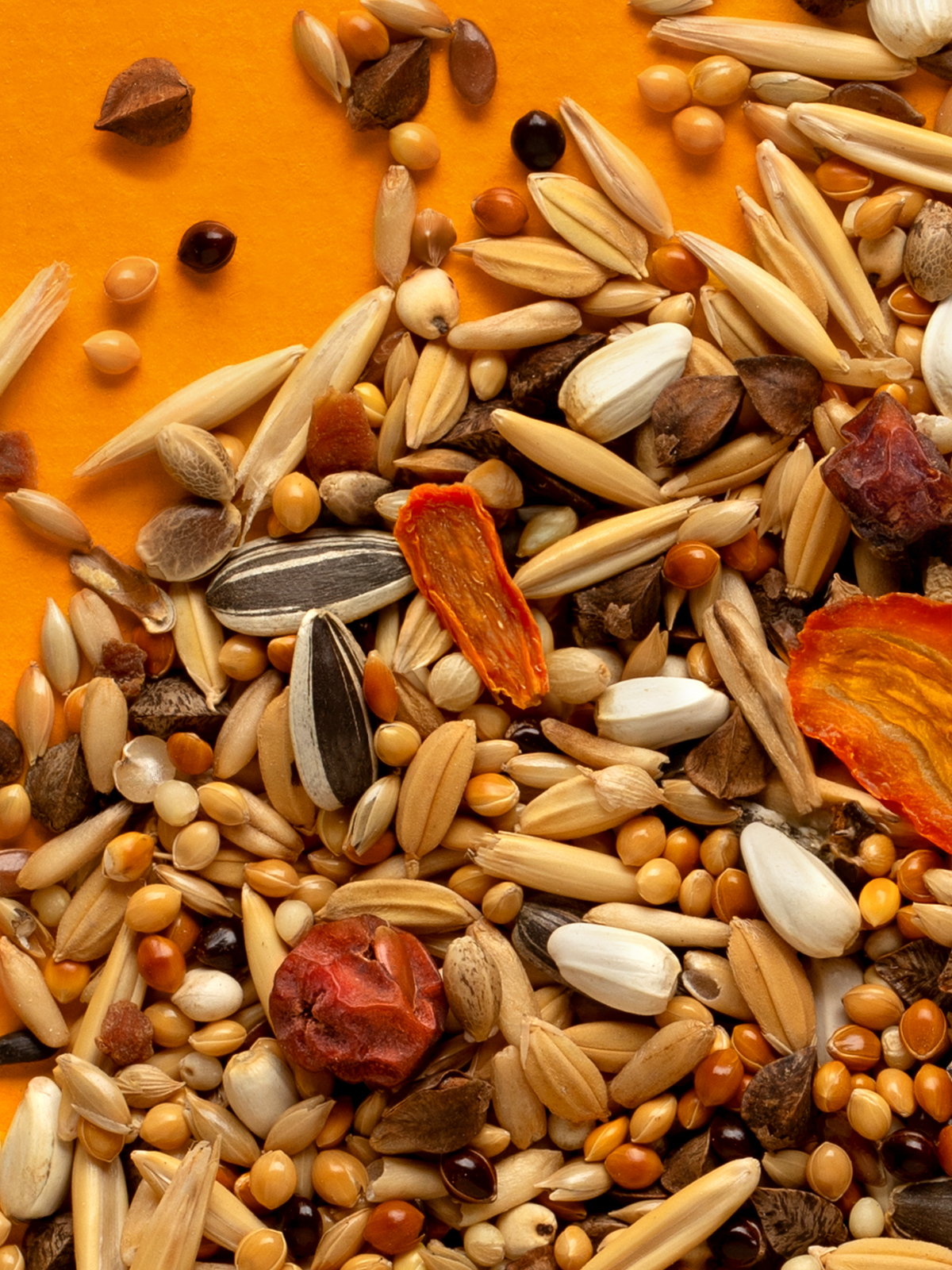 Состав: просо желтое, просо красное, канареечное семя, овсянка, гречиха, сорго белое, сафлор, семена подсолнечника, рис падди, просо черное, семя льна, овес, нуг абиссинский, полезные семена, рябина сушеная, морковь сушеная, водоросли, глюконат кальция.