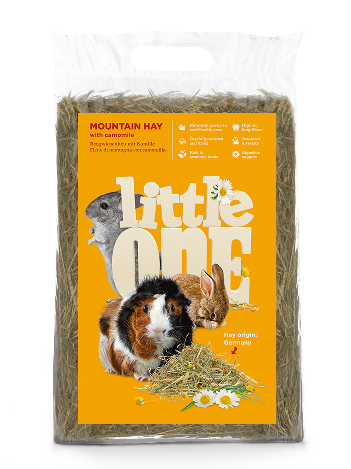 Горное сено с ромашкой Little One — ароматное, очищенное и высушенное; собрано в экологически чистых горных районах и обогащено цветами ромашки. Сено является основной составляющей рациона всех травоядных животных (кроликов, морских свинок, шиншилл, дегу), поэтому важно обеспечить его постоянное наличие в клетке.