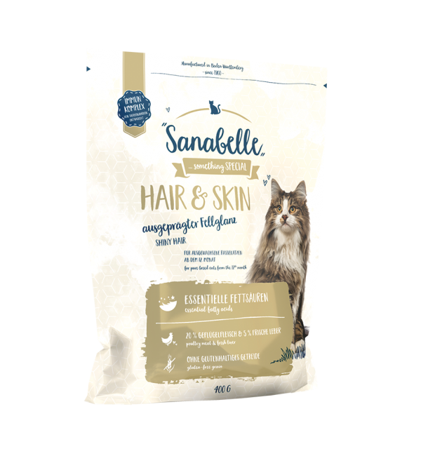 Корм для кошек, которым необходимо особое внимание и уход за кожей и шерстью. Благодаря оптимальному соотношению ненасыщенных жирных кислот (омега-3 и омега-6) рацион Sanabelle HAIR & SKIN устраняет шелушение кожи, делает шерсть более гладкой и блестящей. Специальный комплекс витаминов и минералов, а также высочайшее качество белка, главным источником которого является свежее мясо птицы, улучшают структуру шерсти и снижает интенсивность бесконтрольной линьки.