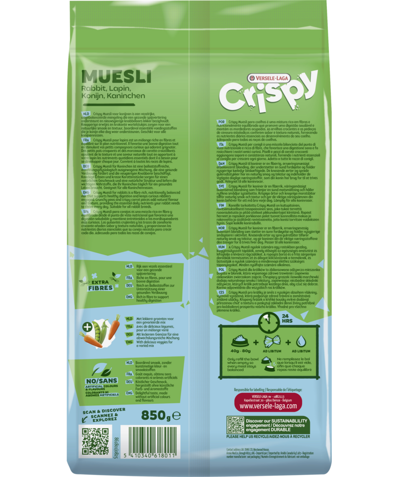 Хрустящие мюсли для кроликов - это богатая клетчаткой, сбалансированная по питательным веществам смесь, полная вкуса и текстуры, которая не даст заскучать любопытным кроликам. Без искусственных красителей и ароматизаторов. Подходит для всех пород кроликов.