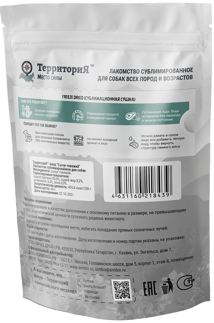 Что это значит? Лакомства ТерриториЯ Амур на 100% состоят из натурального мяса, а инновационная freeze dried технология позволяет сохранить максимум полезных веществ.