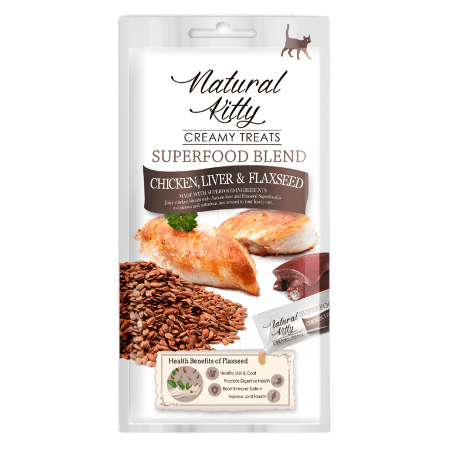 Natural Kitty SUPERFOOD BLEND - Chicken, Liver & Flaxseed - приготовлено на 100% из куриного мяса и куриной печени, с добавлением семян льна, для улучшения питательных свойств, вкуса лакомства и укрепления здоровья. Это лучшая ежедневная награда для ваших кошек. Вы можете угощать своего питомца этим лакомством каждый день в качестве поощрения, дополнительного корма, а также как добавку к основному рациону.