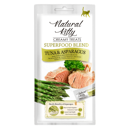Natural Kitty SUPERFOOD BLEND - Tuna & Asparagus - приготовлено на 100% из мяса тунца, с добавлением спаржи для улучшения питательных свойств, вкуса лакомства и укрепления здоровья. Это лучшая ежедневная награда для ваших кошек. Вы можете угощать своего питомца этим лакомством каждый день в качестве поощрения, дополнительного корма, а также как добавку к основному рациону.