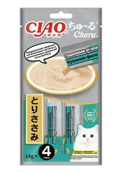 4*14гр Лакомство-пюре INABA CIAO Churu для кошек Поддержание pH мочи с Куриным филе