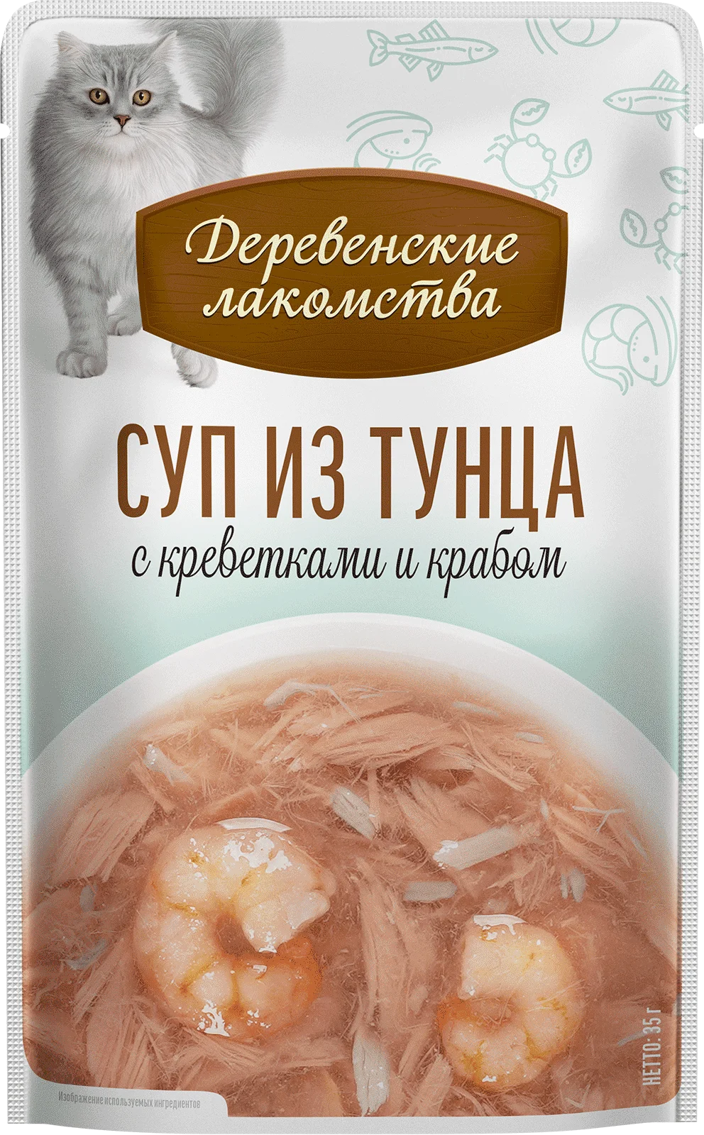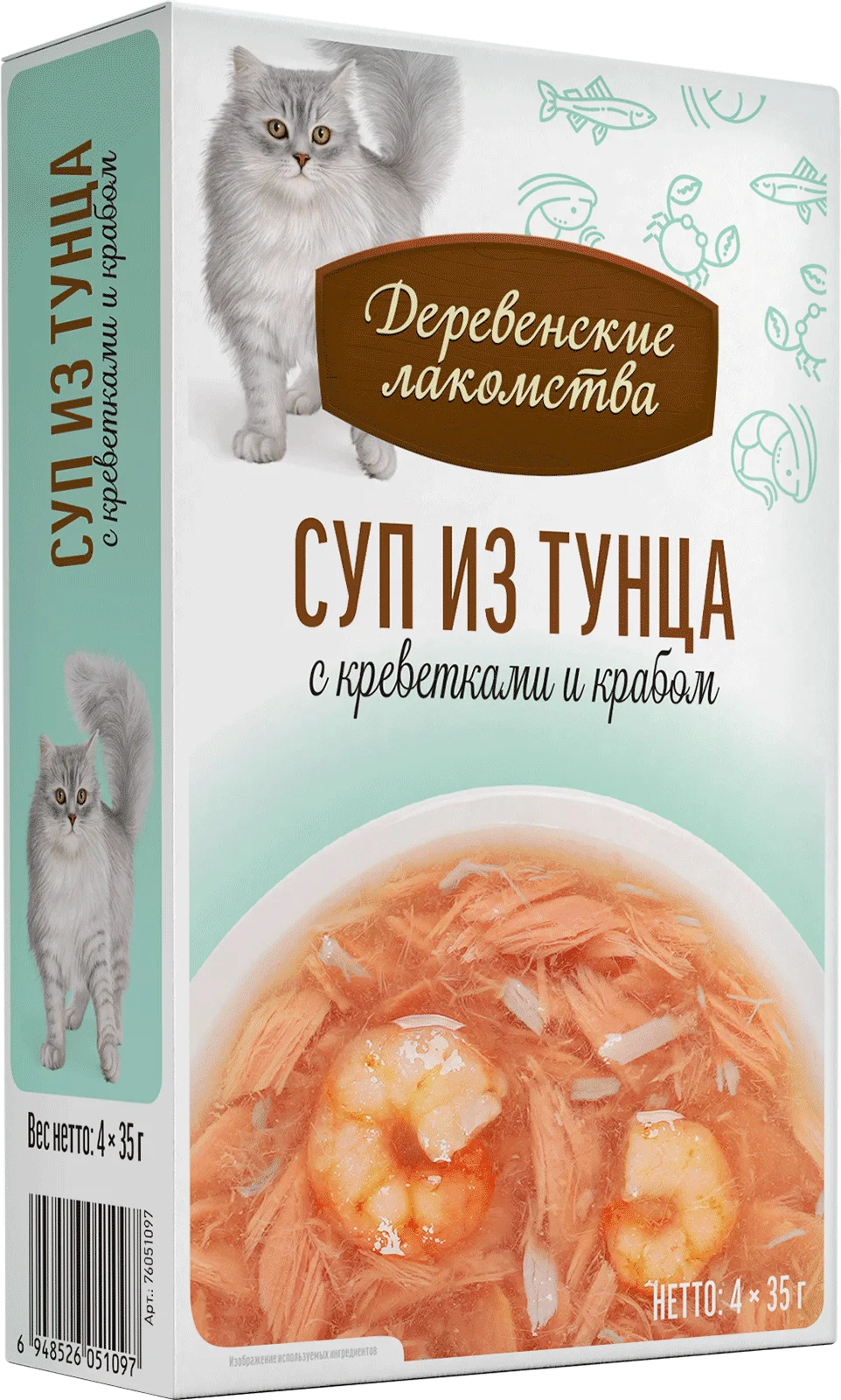 4*35г Лакомство "Деревенские лакомства" для кошек суп из Тунца с Креветками и Крабом