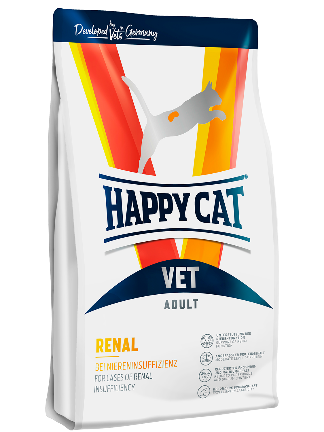 Happy Cat VET Diet Renal - корм для кошек с хронической почечной недостаточностью, гипертензией, нефритом. Сниженное содержание фосфора, натрия и протеина в соответствии с минимальными потребностями. Стимуляция аппетита за счет повышенной вкусовой привлекательности.