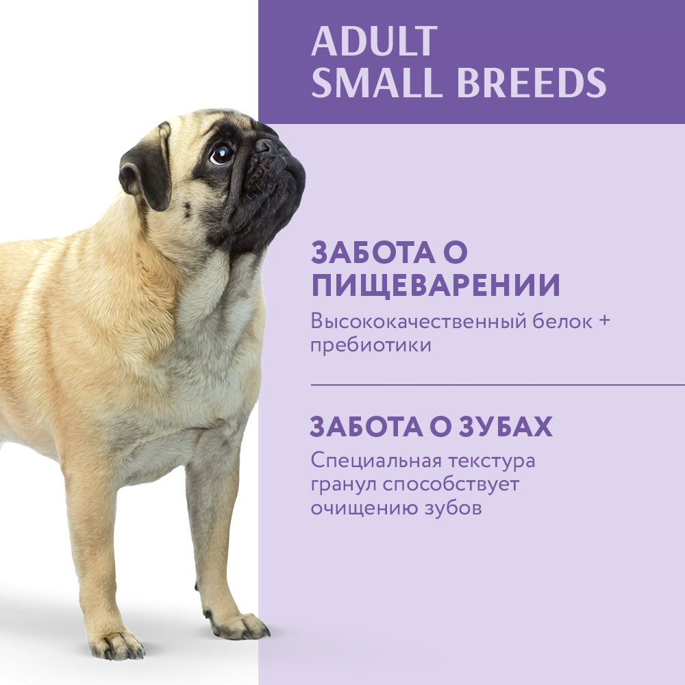 Сухой корм поддерживает здоровье чувствительной пищеварительной системы собак малых пород. Укрепляет иммунитет. Содержит пребиотики, нормализующие микрофлору желудка и кишечника, витамины и минералы. Специальная текстура гранул способствует очищению зубов от налета.