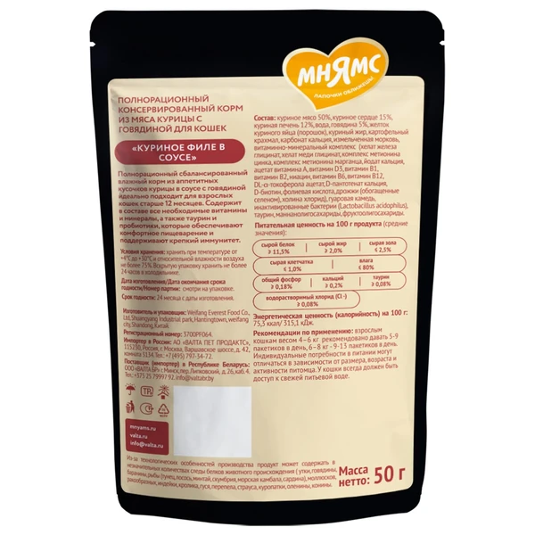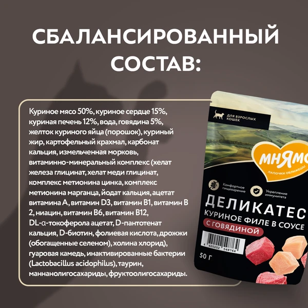 50г Влажный корм Мнямс Деликатес для кошек в соусе Куриное филе с Говядиной
