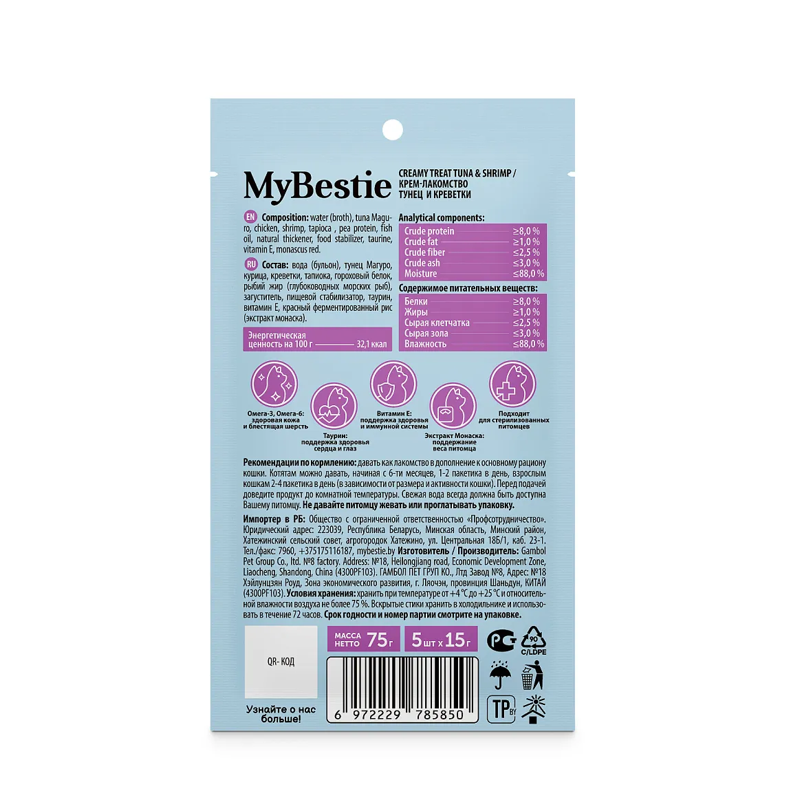 5*15г Крем-лакомство MyBestie для кошек Тунец и Креветки