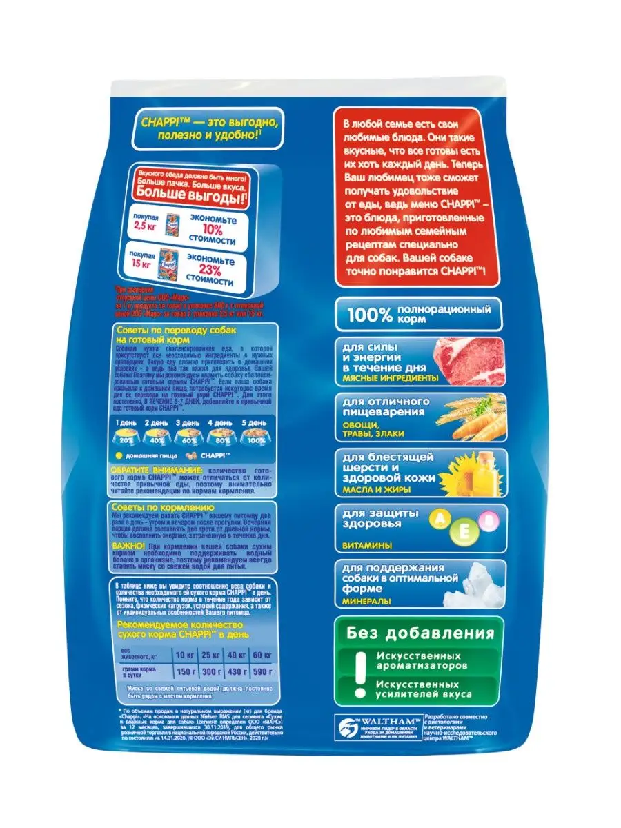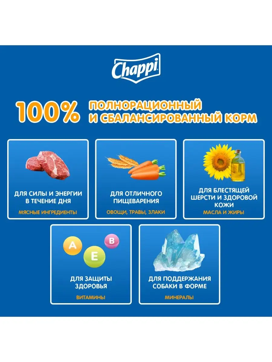 Выбирая полноценное сбалансированное питание Чаппи для Вашего любимца, вы можете быть уверены в том, что каждый день ваша собака будет довольной, игривой и здоровой.