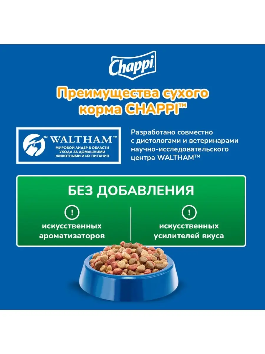 Полнорационный сухой корм для взрослых собак всех пород. Новое вкусное меню от Чаппи станет любимой едой вашей собаки.