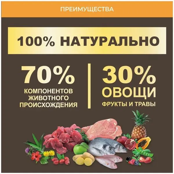 Специально подобранные овощи, гарантирующие постоянный и низкий гликемический индекс, фрукты, травы и лекарственные растения, в том числе Розмарин, Одуванчик, оказывающий благоприятное воздействие на печень, Гранат и Шиповник, богатые витаминами и натуральными антиоксидантами, Ананас, способствующий пищеварению, пребиотики Fos и Mos, нормализующие кишечную флору - благодаря всем этим компонентам корм для собак Примордиал, улучшает здоровье и качество жизни Вашей собаки. При кормлении необходимо учитывать породу, активность, возраст и среду обитания животного.