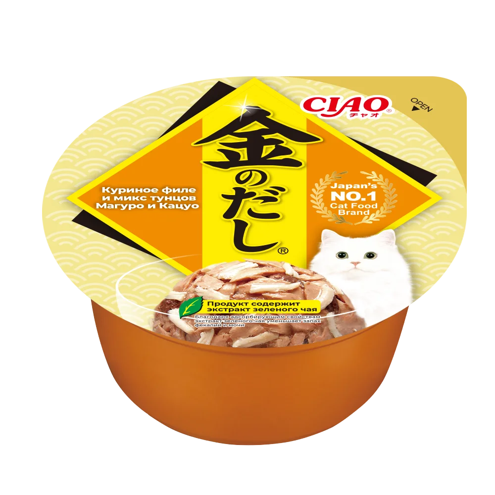 INABA CIAO Kinnodashi cup Куриное филе и микс тунцов — супер-премиальный влажный корм для кошек от японского производителя INABA приготовлен из кусочков куриного филе с добавлением мяса двух разных видов тунца Магуро и Кацуо. Внутри удобной порционной упаковки ароматные нежные волокна в желе, которые подойдут даже самым привередливым кошкам и кошкам с чувствительным пищеварением.
