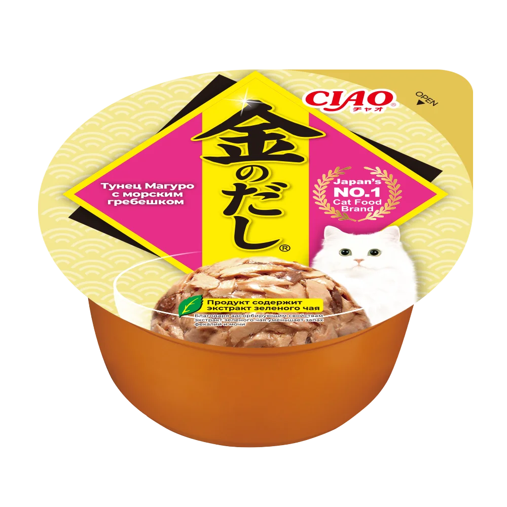 INABA CIAO Kinnodashi cup Тунец Магуро с морским гребешком — супер-премиальный влажный корм для кошек от японского производителя INABA, приготовлен из кусочков кусочков мяса глубоководного тунца Магуро с добавлением морского гребешка. Внутри удобной порционной упаковки ароматные нежные волокна в желе, которые подойдут даже самым привередливым кошкам и кошкам с чувствительным пищеварением.