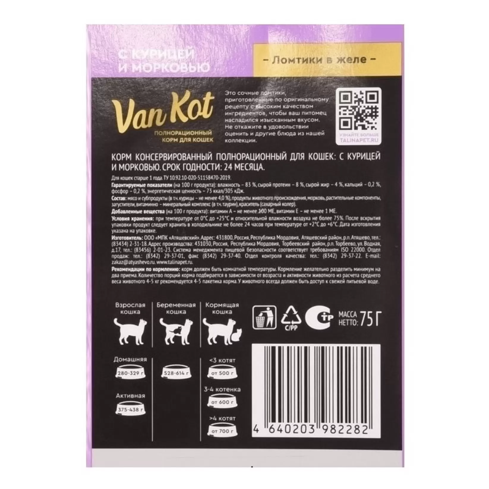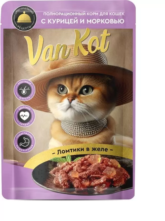 75г Влажный корм Van Kot для кошек с Курицей и Морковью ломтики в желе