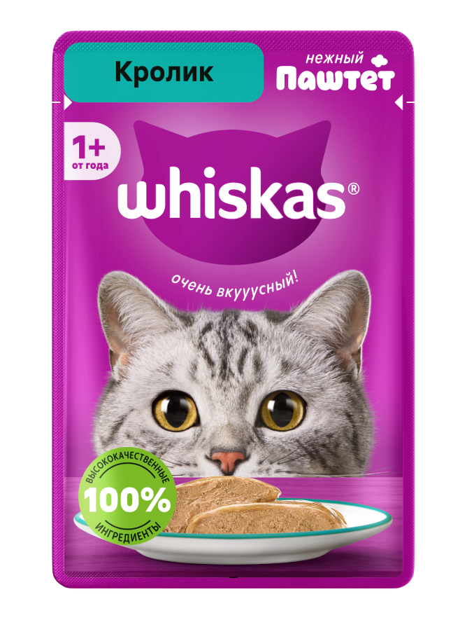 Это сбалансированный рацион, приготовленный именно так, как любит ваша кошка. Аппетитный паштет с кроликом подарит вашей любимице настоящее удовольствие. Рацион Whiskas содержит все необходимое, чтобы еда вашей кошки была не только вкусной, но и полезной.