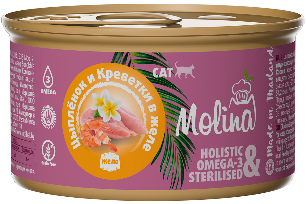 Molina Ламистер для взрослых кошек. Цыпленок и креветки в желе