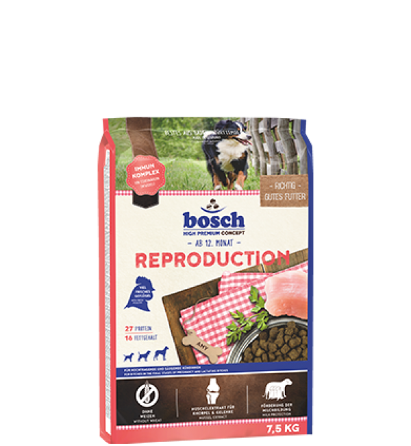 Главная Каталог Зоотовары Корм для собак Сухой корм 7,5кг Корм Bosch Reproduction для кормящих и беременных собак всех пород с Птицей