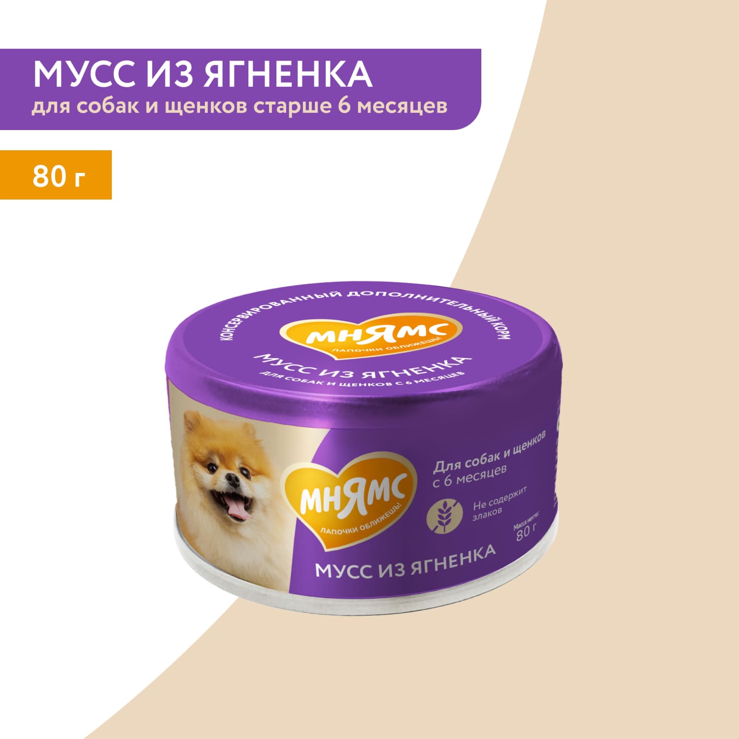 Главная Каталог Зоотовары Корм для собак Консервы 80г Влажный дополнительный корм Мнямс для собак и щенков старше 6 месяцев Мусс из Ягнёнка