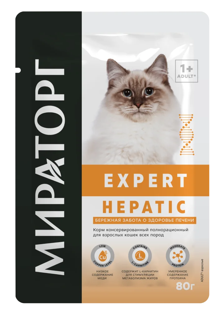 80гр Влажный корм Мираторг Expert Hepatic полнорационный для взрослых кошек всех пород «Бережная забота о здоровье печени» с Курицей и индейкой