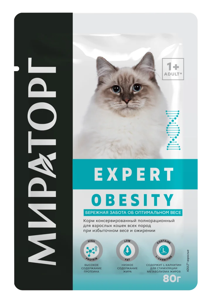 Главная Каталог Зоотовары Корм для кошек Консервы 80гр Влажный корм Мираторг Expert Obesity полнорационный для взрослых кошек всех пород при избыточном весе и ожирении «Бережная забота об оптимальном весе» с Курицей и говядиной