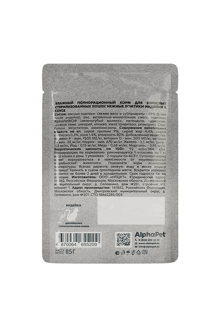85г Влажный корм AlphaPet WOW для стерилизованных кошек с Индейкой нежные ломтики в соусе
