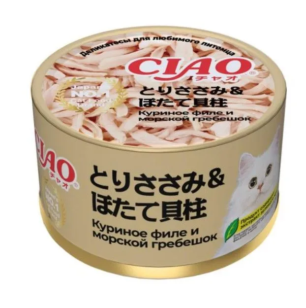 INABA CIAO can Куриное филе с морским гребешком — супер-премиальный влажный корм для кошек от японского производителя INABA приготовлен на основе кусочков филе фермерской курицы с добавлением морского гребешка. Внутри упаковки ароматные нежные волокна в желе, которые подойдут даже самым привередливым кошкам и кошкам с чувствительным пищеварением.