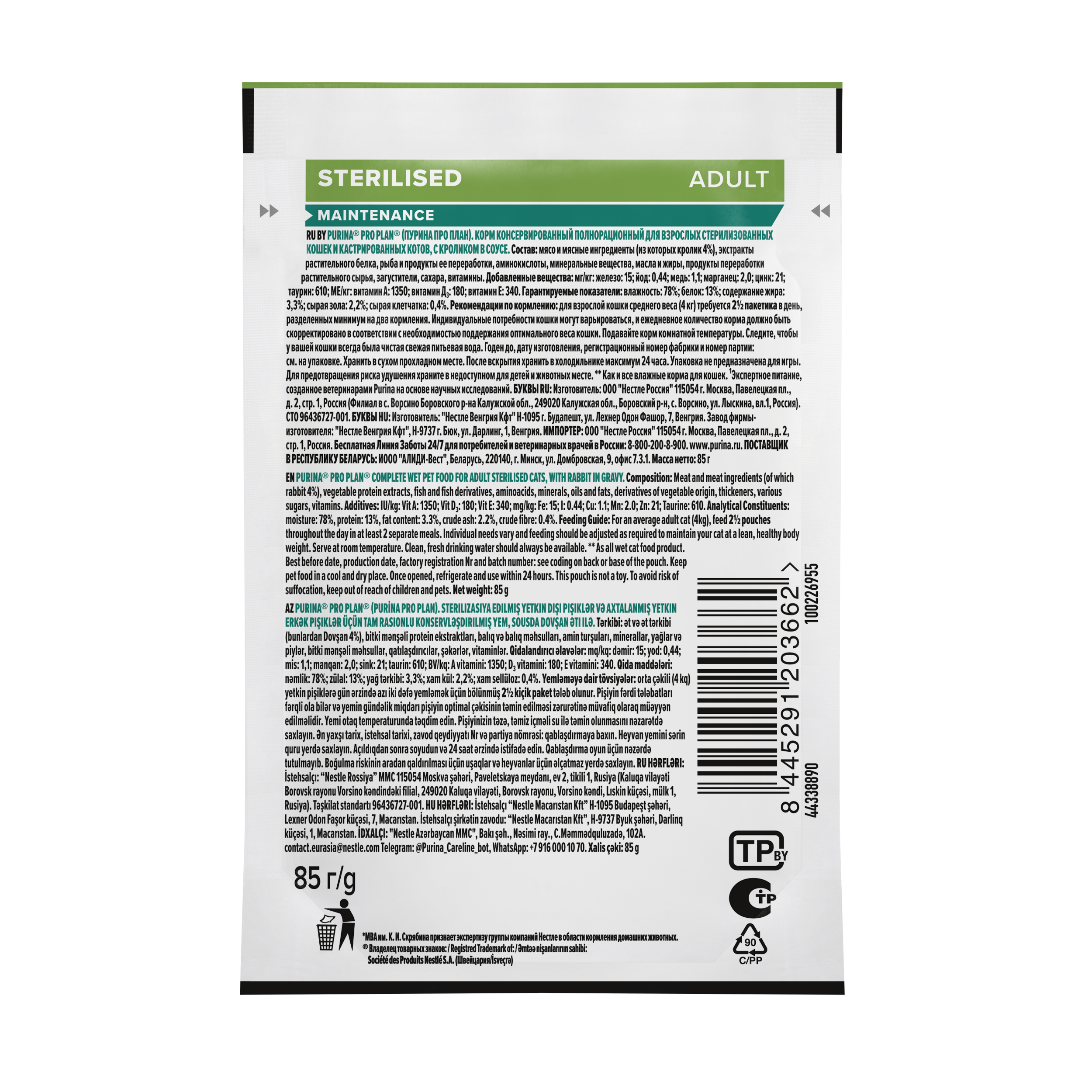85гр Корм для кошек PRO PLAN Sterilised с Кроликом в соусе