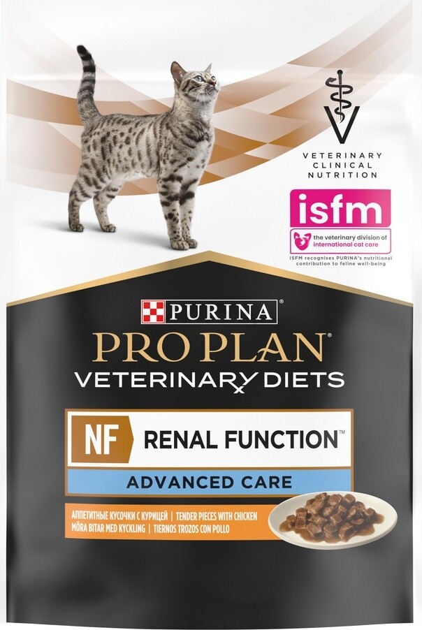 Влажный корм для кошек PURINA PRO PLAN NF Renal Function Advanced Care курица для поддержания функции почек при поздней стадии хронической почечной недостаточности. Содержит ограниченное количество высококачественного белка, а также ограниченное количество фосфора, с повышенным содержанием омега-3 жирных кислот. Данный корм обладает высокой вкусовой привлекательностью для кошек со сниженным аппетитом. Использование данного корма рекомендовано под наблюдением ветеринарного врача. Подходит для всех пород.