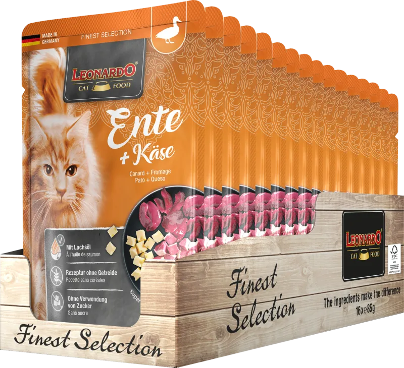 То самое «что-то особенное»: утка придает блюду насыщенный вкус, а кубики сыра — особенно приятный сюрприз. Благодаря ценным жирным кислотам Омега-3, они также улучшают самочувствие наших четвероногих любимцев. Еще один плюс от LEONARDO Duck + Cheese: мягкая и блестящая шерсть — благодаря полиненасыщенным жирным кислотам из лососевого масла.
