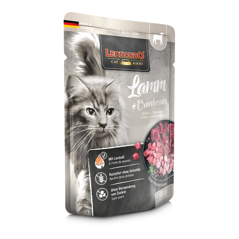 Суперфуд! Это сочетание легкоусвояемой баранины, лучших сортов птицы и красных «чудодейственных» ягод особенно подходит как для гурманов, так и для кошек с чувствительным желудком. Клюква богата антиоксидантами и витаминами. Также превосходно: LEONARDO Lamb + Cranberries содержит лососевое масло, обеспечивающее полиненасыщенные жирные кислоты для блестящей шерсти.