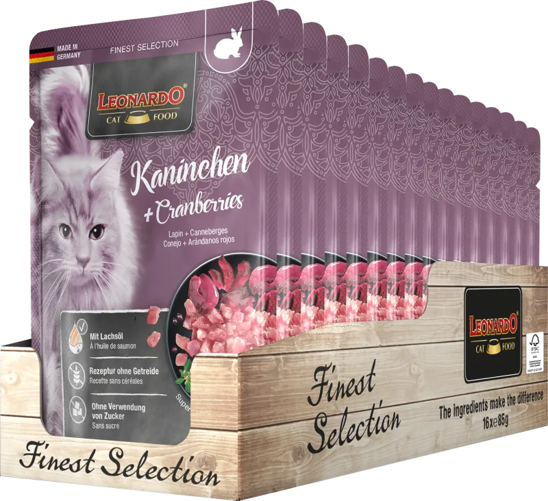 Поистине восхитительное сочетание ароматного кроличьего мяса и клюквы, суперфуда, богатого ценными ингредиентами. А еще оно полезно для шерсти: LEONARDO Rabbit + Cranberries, содержащий полиненасыщенные жирные кислоты из лососевого масла, придает шерсти великолепный блеск!