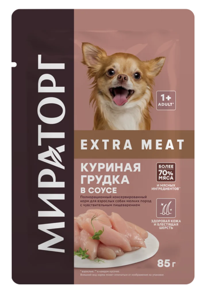 85гр Влажный корм Мираторг Extra Meat полнорационный для взрослых собак мелких пород с чувствительным пищеварением, соус с Куриной грудкой