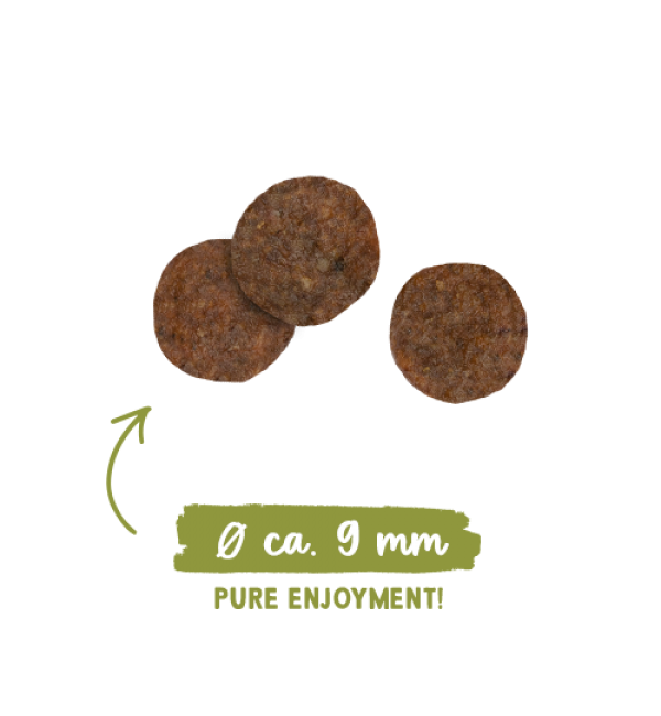 Состав: свежее мясо курицы (25 %), картофельная мука (17,5 %), картофельный крахмал, белок из птицы (сушеный), шкварки (сушеные), картофельный белок, животный жир, семена льна, белковый гидролизат, сушеный свекольный жом (обессахаренный), мука, гороховые волокна, горох (сушеный, 0,5 %), масло лосося (0,5 %), карбонат кальция, ягоды брусники (сушеные, 0,1 %), ягоды голубики (сушеные, 0,1 %), петрушка (сушеная, 0,1 %), дрожжи (сушеные, 0,1 %), цветы календулы (сушеные, 0,05 %).