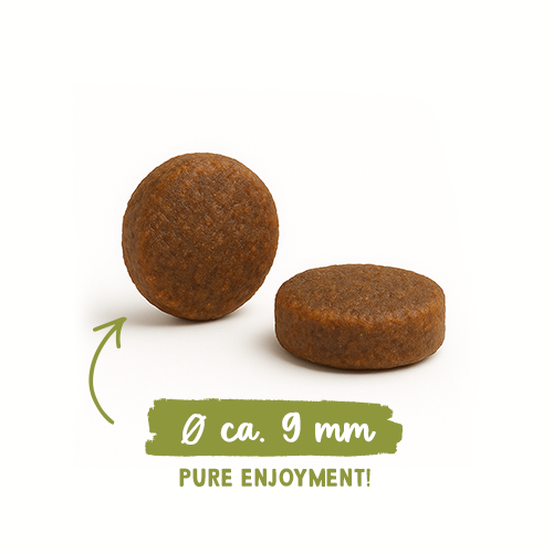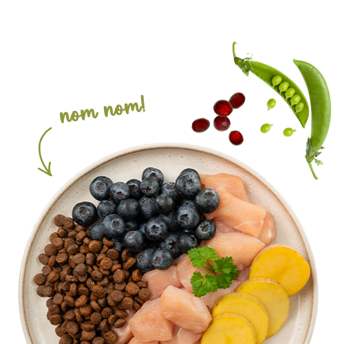 Состав: свежее мясо курицы (25 %), картофельная мука (17,5 %), картофельный крахмал, белок из птицы (сушеный), шкварки (сушеные), картофельный белок, животный жир, семена льна, белковый гидролизат, сушеный свекольный жом (обессахаренный), мука, гороховые волокна, горох (сушеный, 0,5 %), масло лосося (0,5 %), карбонат кальция, ягоды брусники (сушеные, 0,1 %), ягоды голубики (сушеные, 0,1 %), петрушка (сушеная, 0,1 %), дрожжи (сушеные, 0,1 %), цветы календулы (сушеные, 0,05 %).