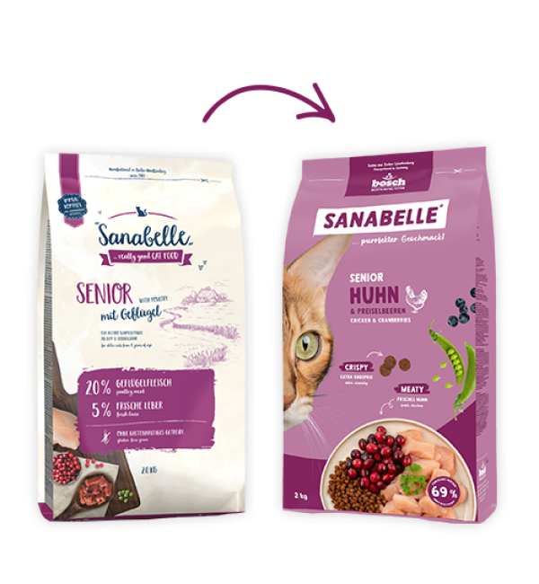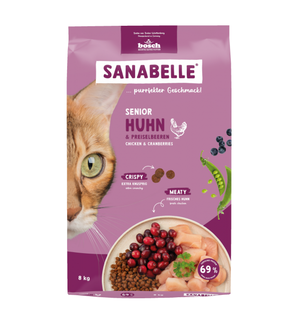 Корм Bosch Sanabelle SENIOR произведён на основе свежего мяса курицы  для взрослых кошек всех пород старше 8 лет. За счет пониженного содержания энергии, белка и минералов, а также повышенной доли специальной клетчатки (сырой клетчатки) корм Sanabelle Senior с мясом курицы адаптируется к меняющимся условиям в желудочно-кишечном тракте и специфическому метаболизму пожилых кошек. Кроме того, комбинация используемых специальных витаминов (например, витамины А, Е) поддерживает естественное зрение и защищает клетки организма от старения.