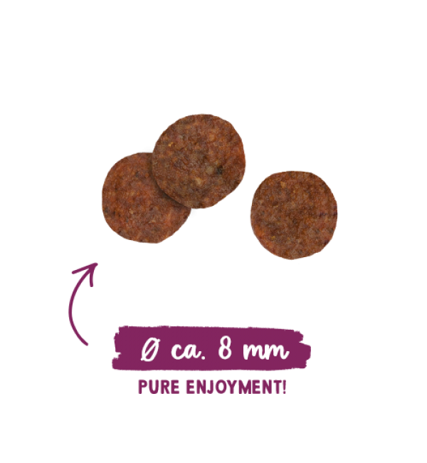 Состав: свежее мясо курицы (20 %), ячмень, кукуруза, белок из птицы (сушеный), сушеный свекольный жом (обессахаренный), шкварки (сушеные), кукурузный белок, животный жир, белковый гидролизат, целлюлоза, рис (1 %), семена льна, горох (сушеный, 0,8 %), мука, карбонат кальция, масло лосося (0,5 %), хлорид калия, хлорид натрия, ягоды брусники (сушеные, 0,1 %), ягоды голубики (сушеные, 0,1 %), петрушка сушеная (0,1 %), дрожжи (сушеные, 0,1 %), цветы календулы (сушеные, 0,05 %).