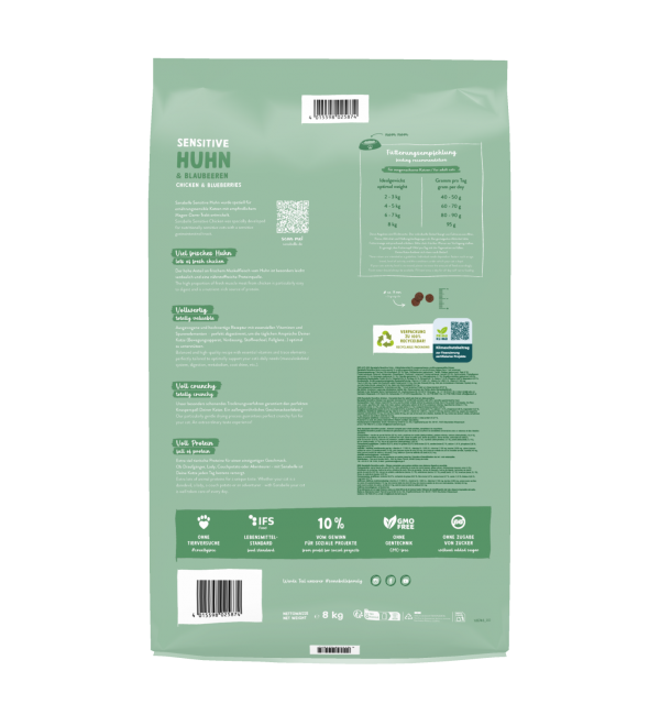 Состав: свежее мясо курицы (25 %), кукуруза, белок из птицы (сушеный), животный жир, шкварки (сушеные), рис (4 %), белковый гидролизат, рисовая мука, кукурузный белок, гороховые волокна, рыбная мука, мука, карбонат кальция, масло лосося (0,5 %), хлорид калия, ягоды брусники (сушеные, 0,1 %), ягоды голубики (сушеные, 0,1 %), петрушка (сушеная, 0,1 %), дрожжи (сушеные, 0,1 %), цветы календулы (сушеные, 0,05 %).