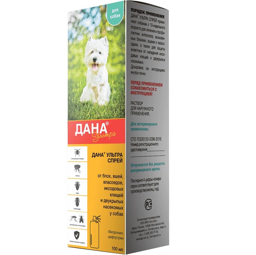Дана Ультра спрей применяют собакам с 10-недельного возраста для лечения и профилактики энтомозов, вызываемых блохами, вшами и власоедами, а также для защиты животных от нападения иксодовых клещей и двукрылых насекомых. После нанесения препарата на кожу животного его активные компоненты, практически не всасываясь в системный кровоток, быстро распределяются по поверхности тела, накапливаются в эпидермисе, волосяных луковицах и сальных железах, оказывая длительное контактное инсектоакарицидное и репеллентное действие. Продолжительность защитного действия препарата против блох, вшей и власоедов составляет 6 – 8 недель, против иксодовых клещей – 3 – 4 недели, репеллентное действие против двукрылых насекомых – 3 – 5 дней.
