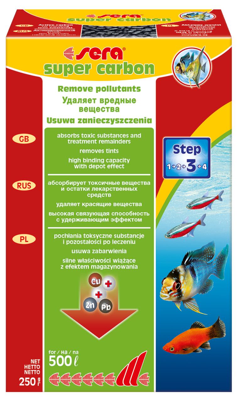 Гранулированный активированный уголь для фильтров sera супер карбон быстро и надежно абсорбирует ядовитые и красящие вещества из аквариумной воды. Желтоватый оттенок исчезает и аквариумная вода становится кристально чистой. sera супер карбон не влияет на pH-уровень и не содержит фосфатов и нитратов.