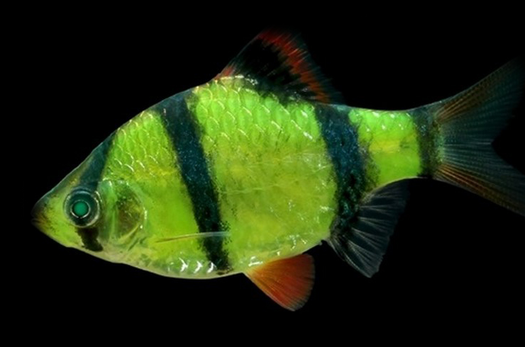 Это стало возможным благодаря искусственному внедрению в ДНК рыбок генов морских кишечнополостных, ответственных за синтез флюоресцентных белков. Снаружи барбусы глофиш окрашены в очень яркие и резкие (кислотные) цвета. Если же их подсветить ультрафиолетом или лампой с преобладанием синего спектра, то рыбки в прямом смысле «вспыхивают», точно новогодняя гирлянда.