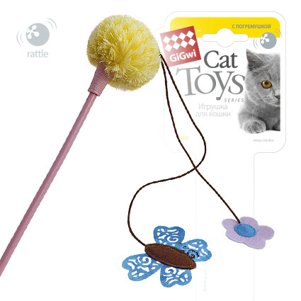 Дразнилка GiGwi для кошек на стеке, с бабочкой, цветком и погремушкой, 45см
